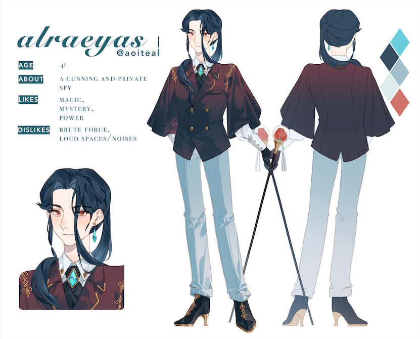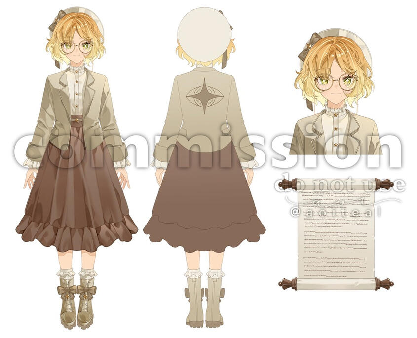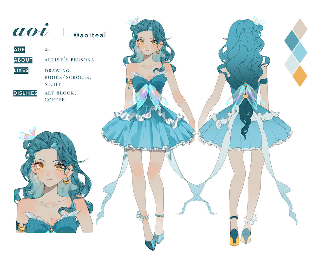 A design sheet for characters and vtuber models, including the front and back of a character’s design. Should include reference images for inspiration and style!