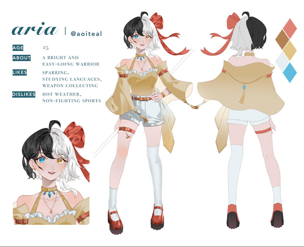 A design sheet for characters and vtuber models, including the front and back of a character’s design. Should include reference images for inspiration and style!